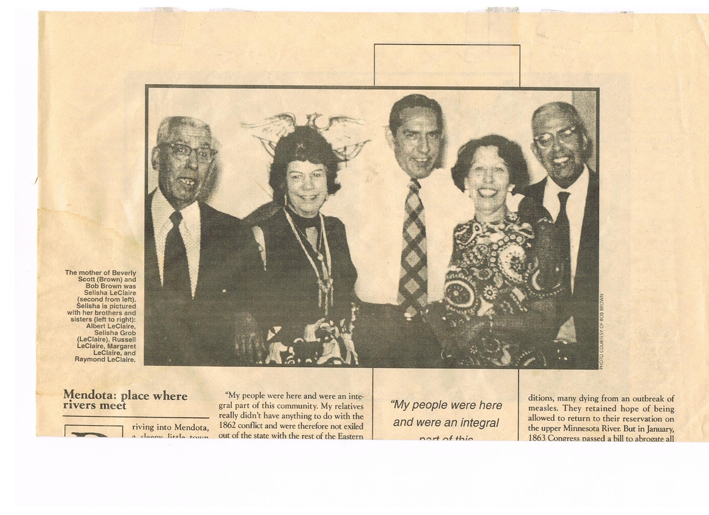 The Mother of Beverly Scott Brown and Bob Brown was Selisha LeClaire. Selisha is pictured with her brothers and sisters Albert LeClaire, Selisha Grob Leclaire, Russel Leclaire, Margaret LeClaire and Raymond LeClaire. Felisha's children, from oldest to youngest are Micky, Beverly, Morri, Bob, Sharon and Linda.