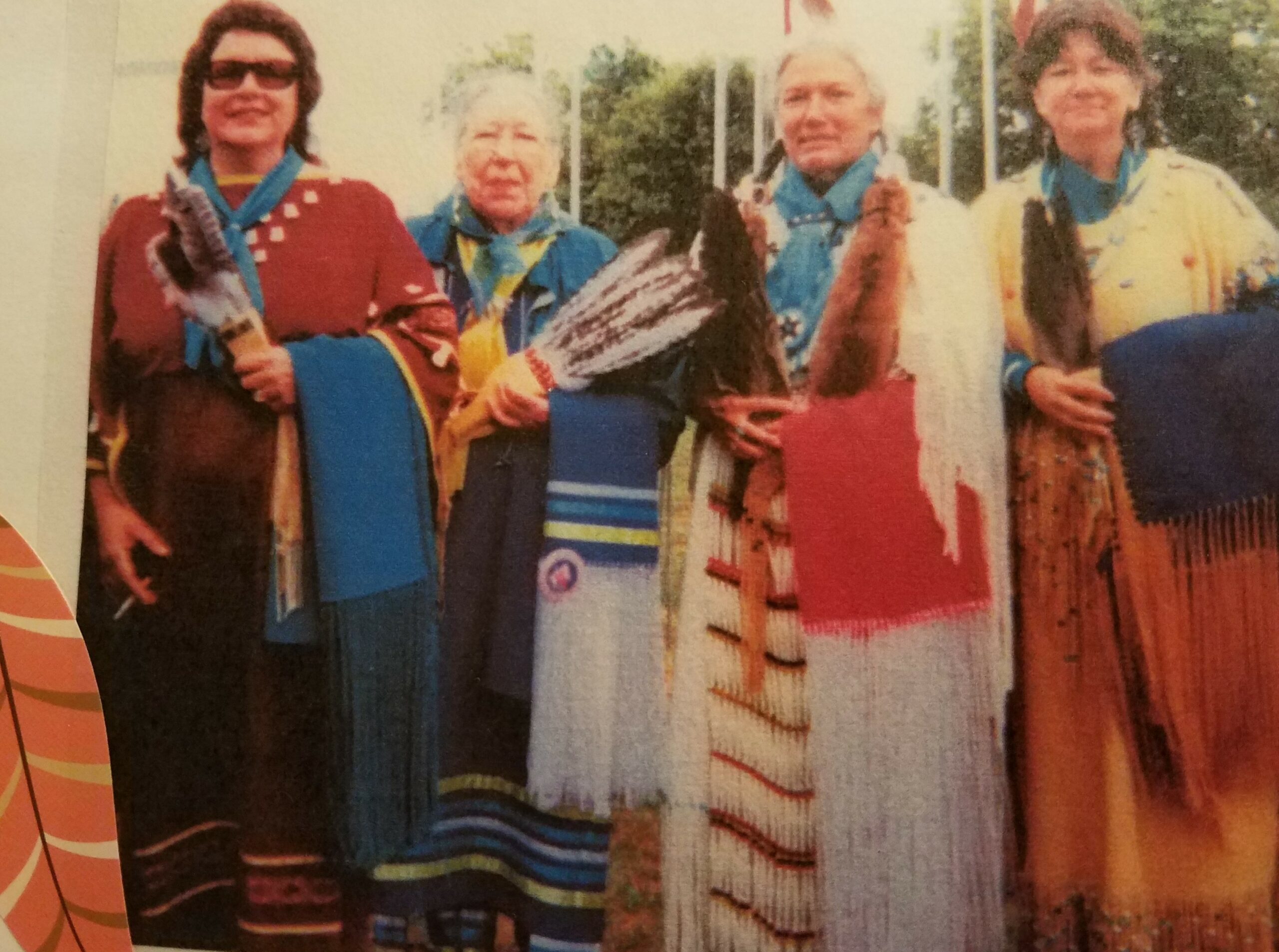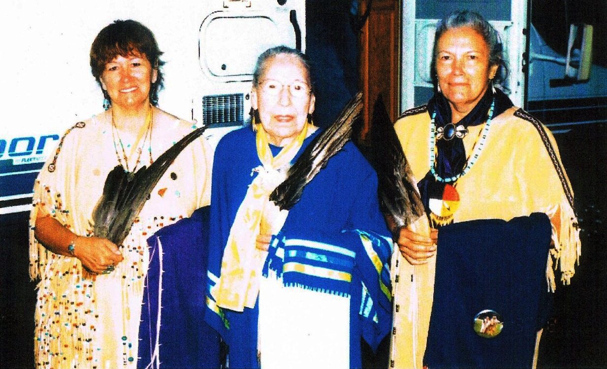 Sharon Lennartson, Marie Winona Nordin, Beverly Scott.Holding traditional feather fans. MMDC Wacipi.