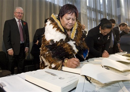 Hundreds of Maori, some wearing traditional feather cloaks, thronged the nation’s Parliament in Wellington to witness the signing of the agreement. Chants, challenges and conch shell notes rang out during the ceremony; some wiped tears from their eyes during the speeches and signing.