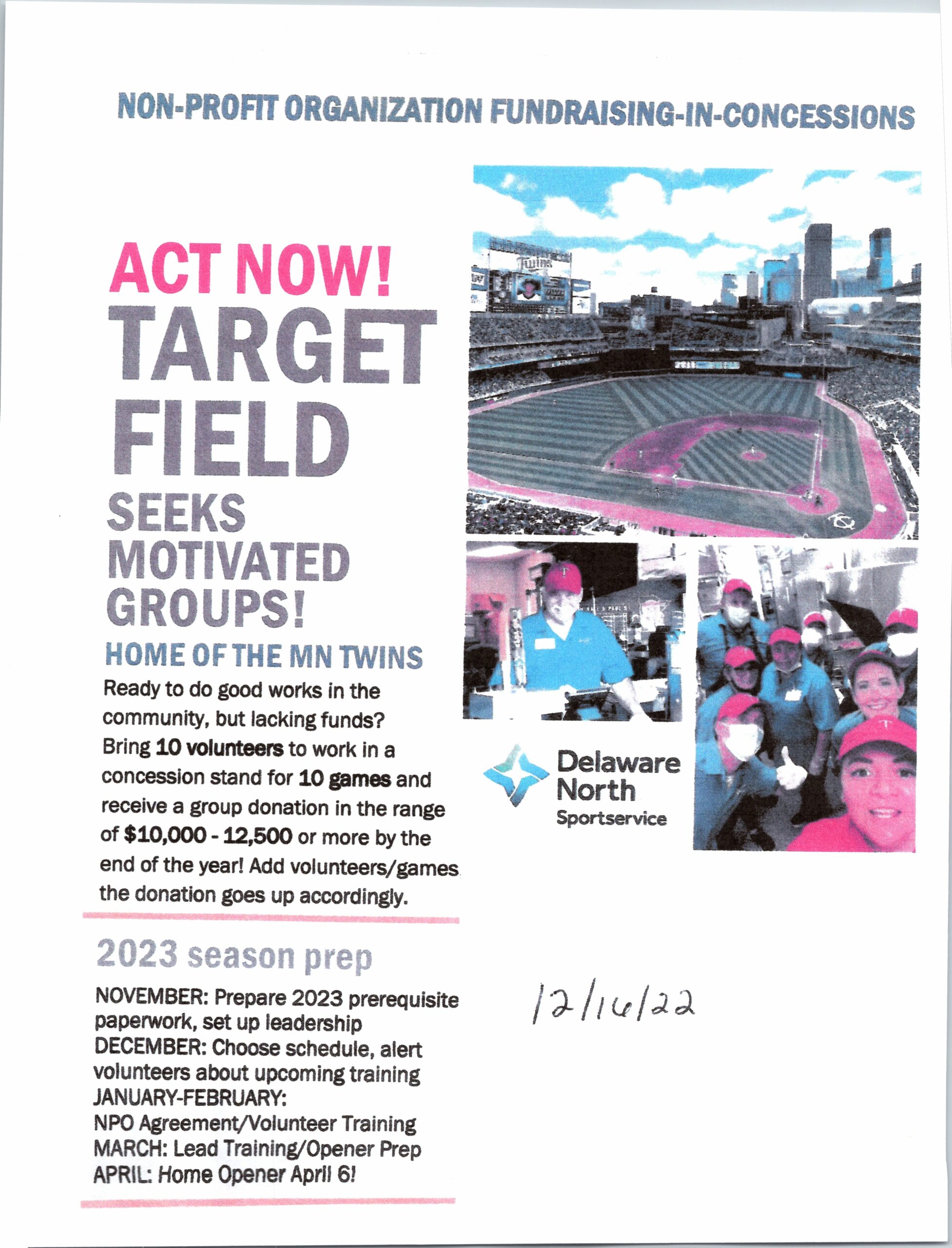 Target Field seek motivated 501 C3 groups. Look on our website for more details. Email